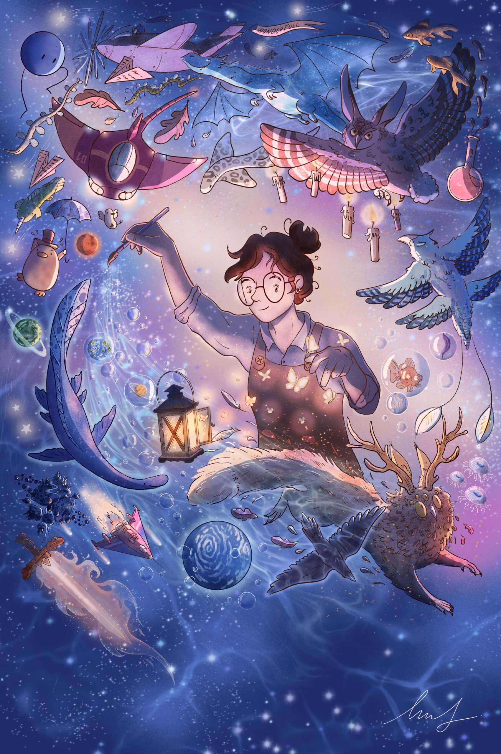 Par le pouvoir de mes crayons et pinceaux, j’imagine et je crée des univers uniques ainsi que leurs histoires.